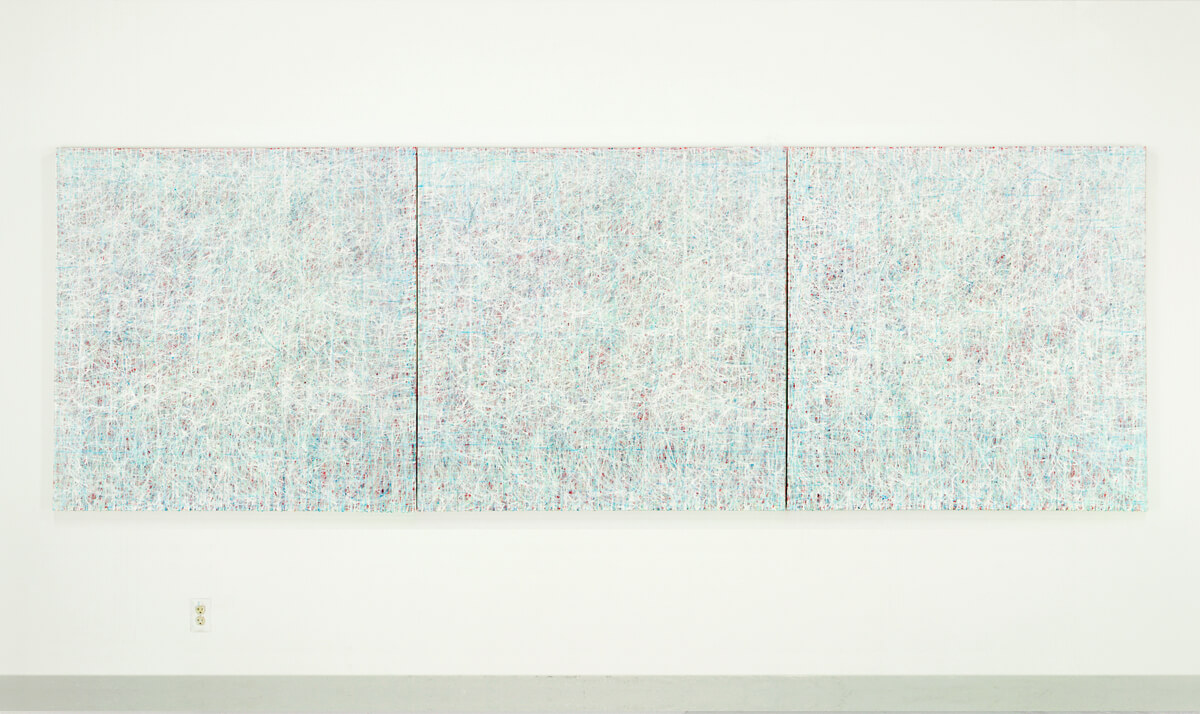 The creation of Swirls occurred over extended periods of time in a process that can be described as controlled and meditative. Starting with an intense red prime, I applied many layers of off-white paint in thin, rhythmic brush strokes. The swirly movement, covering the entirety of the canvas make up a painting that appears playfully upbeat, monochromatic but also hard-edged.