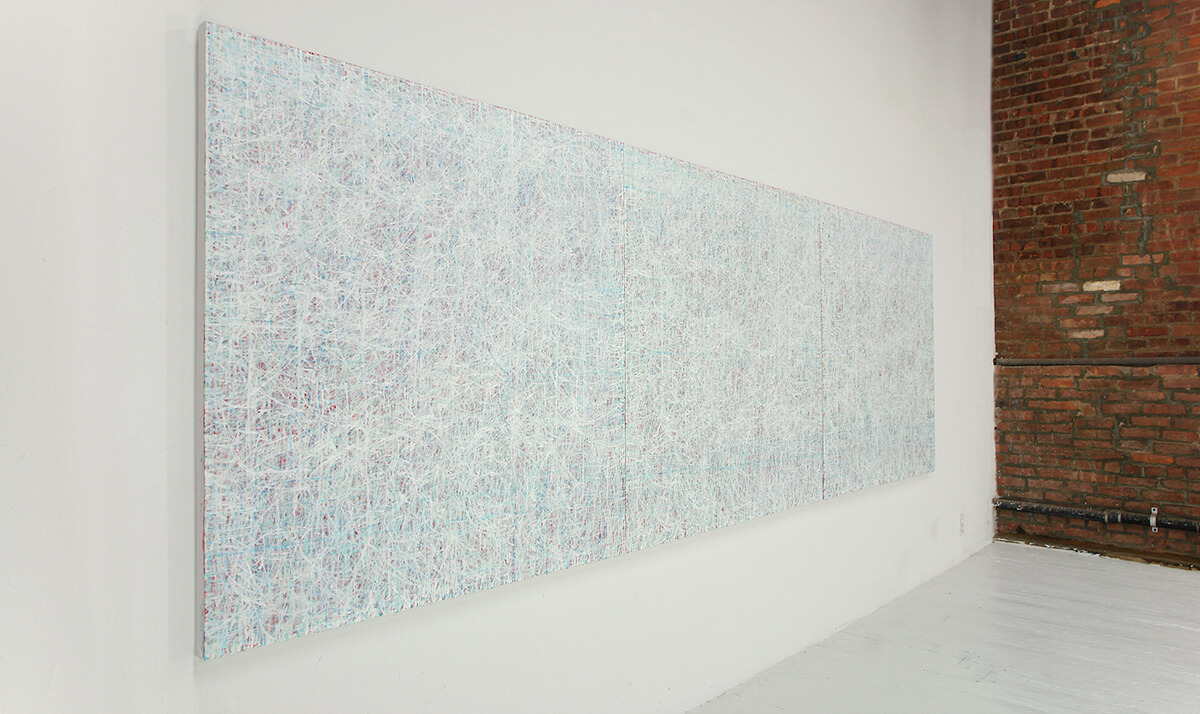 As with other Lights and Shadows pieces, the painting process with its slight color variations creates a subtle but vibrant viewing experience that captures shifting light conditions over the course of a day. In the morning, the piece appears in a cool white and blue; in the afternoon, red color pigments light up creating the appearance of a warm color spectrum.
